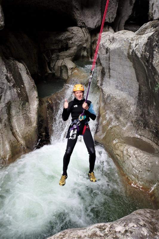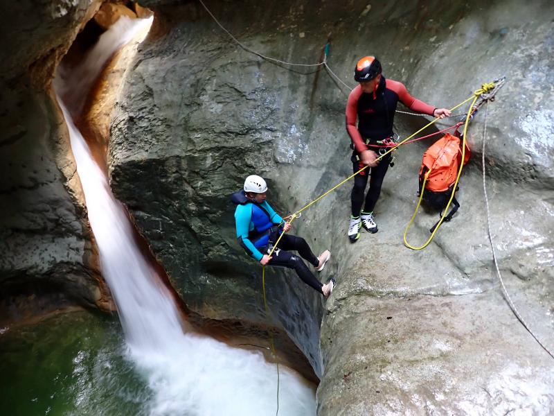 Après être monté sur une terrasse et pour finir l’aventure, vous vous initierez aux joies du rappel sur une descente de 15 mètres. A la fin de ce parcours, vous enlèverez votre équipement et il vous faudra marcher environ 45 minutes pour revenir au parking du départ du canyon.