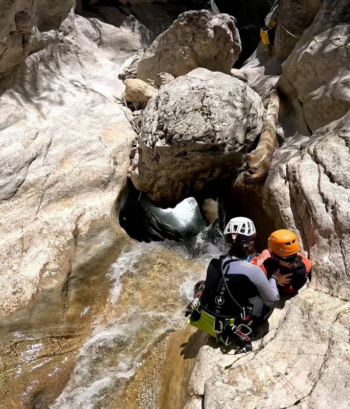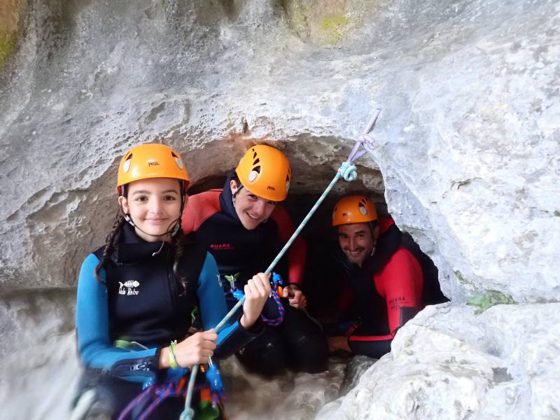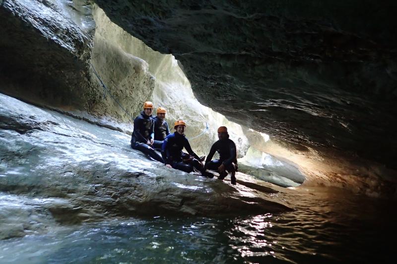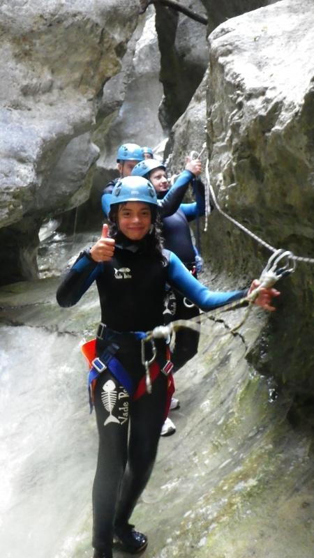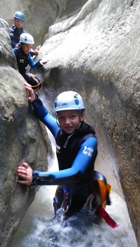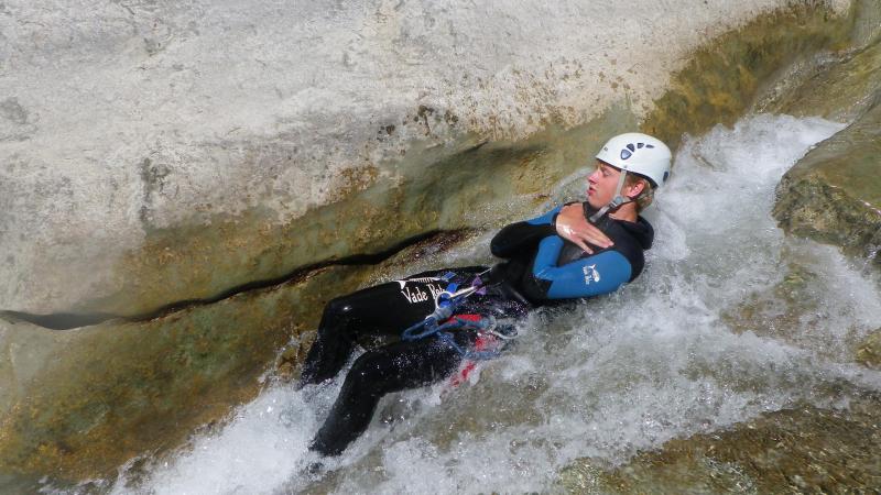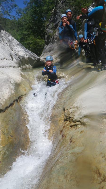 Arrivés au départ du canyon, vous enfilerez votre combinaison néoprène ainsi que votre baudrier et casque. Votre moniteur vous donnera toutes les consignes permettant de pratiquer le canyoning en toute sécurité et vous pourrez commencer à vous immerger pour prendre la température. Après une courte marche en rivière vous accéderez au départ du premier toboggan de 4 mètres.